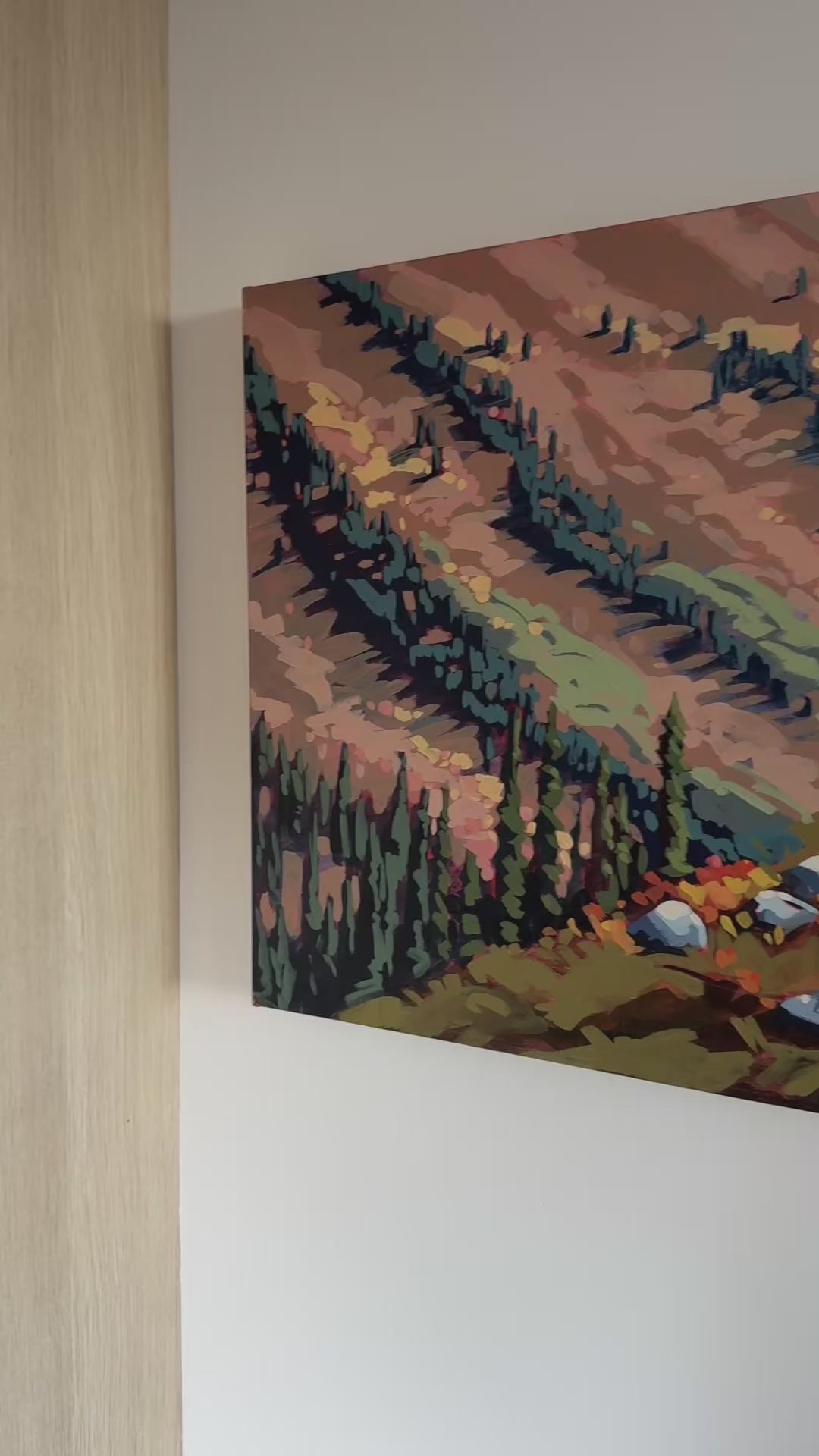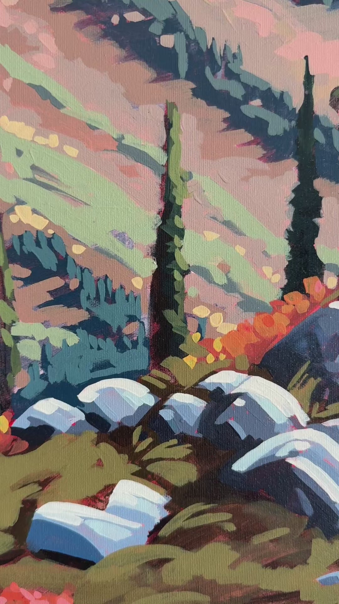 Experience the vibrant beauty of a sunny autumn day in the subalpine with this original landscape painting by Canadian West Coast artist, Christina Clarke. The rich palette of subtle pinks and blues, vibrant reds, neutral greens evoke the vibrancy of fall in the Pacific Northwest. Measuring 18" x 36" x 1.5", this piece is finished with a protective satin varnish and is ready to be displayed, whether framed or unframed.